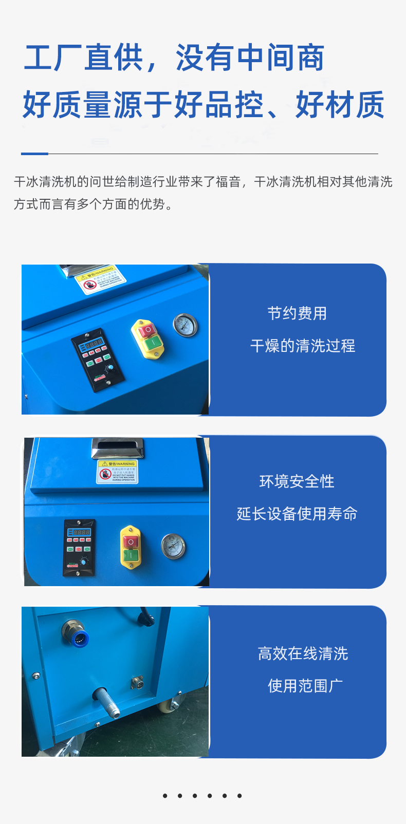 干冰清洗降低了清洗的人工成本、生產(chǎn)設(shè)備的停機(jī)時(shí)間和廢物處理成本,從而減少了清洗的諸多負(fù)面影響;并且不需要干燥和冷卻時(shí)間,降低了很多不必要的成本。