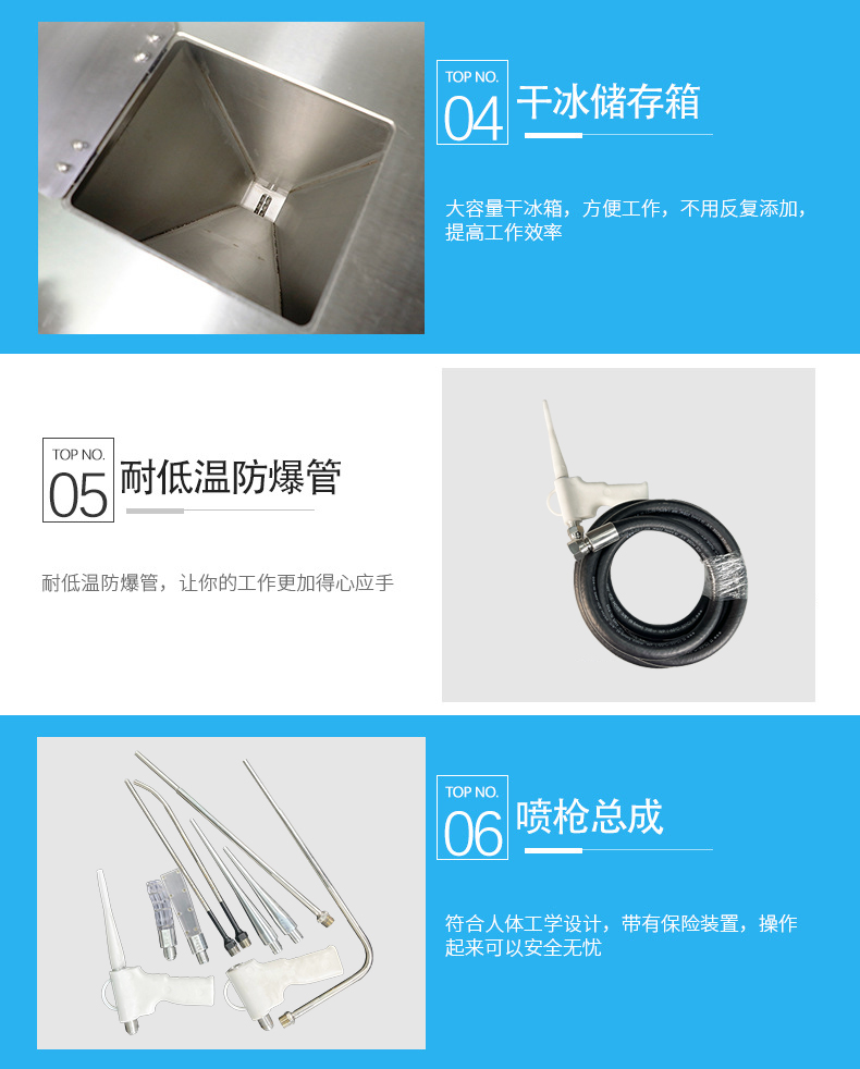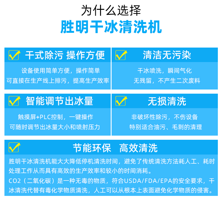 干冰清洗降低了清洗的人工成本、生產(chǎn)設(shè)備的停機(jī)時間和廢物處理成本,從而減少了清洗的諸多負(fù)面影響;并且不需要干燥和冷卻時間,降低了很多不必要的成本。